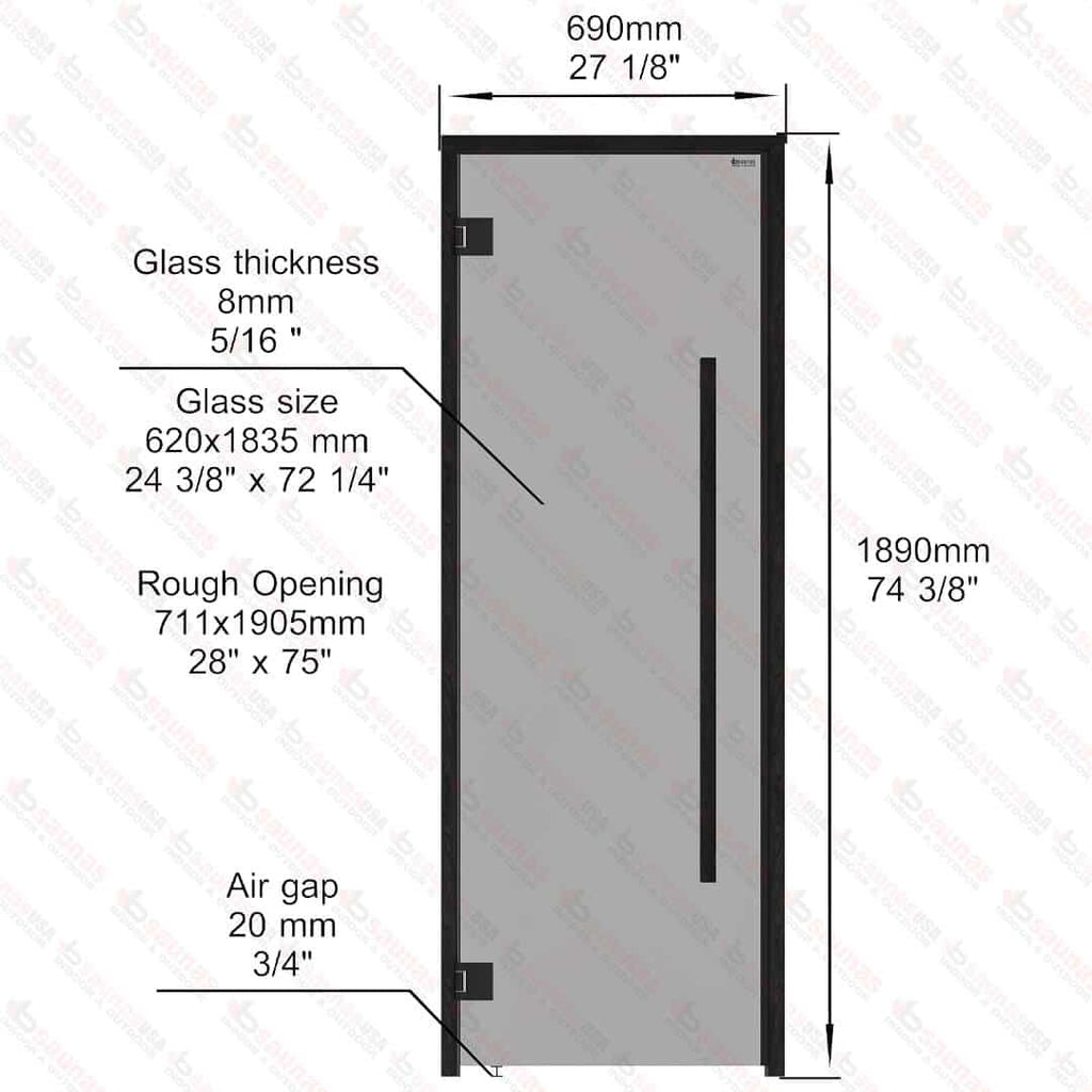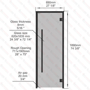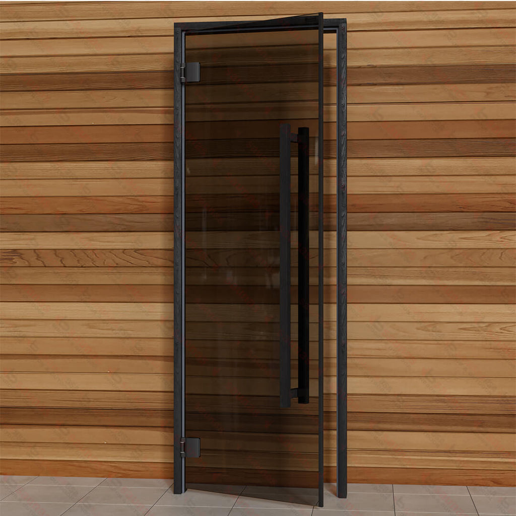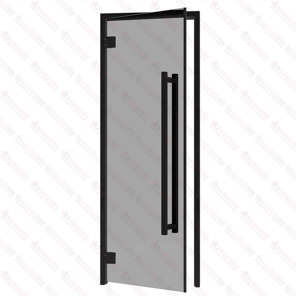 This Benelux door features an elegant grey glass, providing a slightly tinted view that enhances privacy while still allowing for visibility. The subtle tint adds a touch of sophistication and style, making this door a standout feature in your sauna.