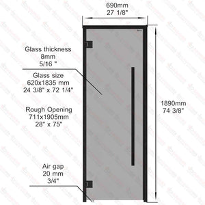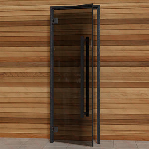 The Benelux Square Grey Glass Black Frame Door comes pre-hung in the frame, ensuring easy installation. All necessary hardware, finished in matching black, is included, further simplifying the assembly process. The door is fitted with 8mm-thick tempered glass, making it sauna-rated and perfectly suited to withstand the unique conditions of a sauna environment.