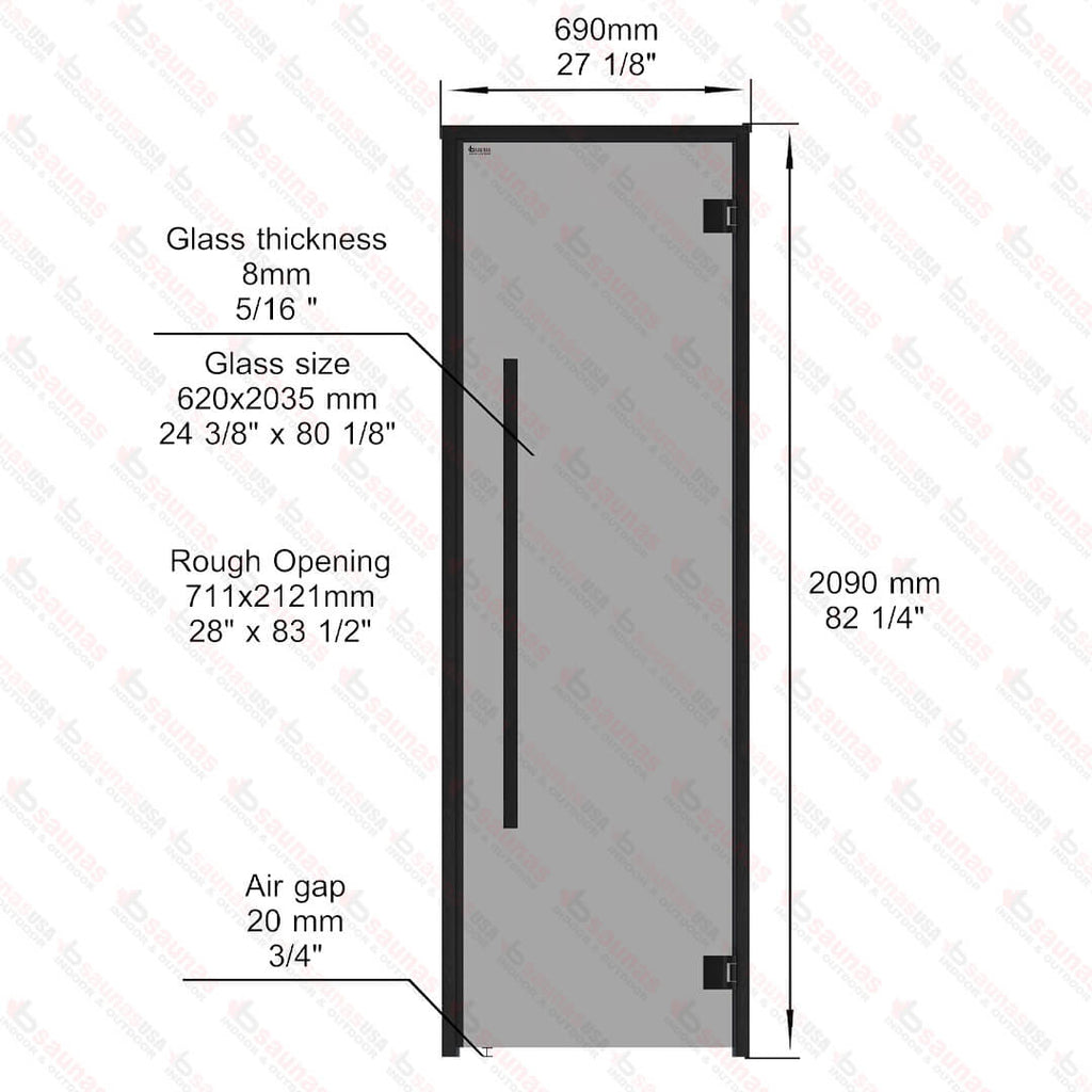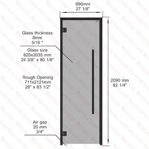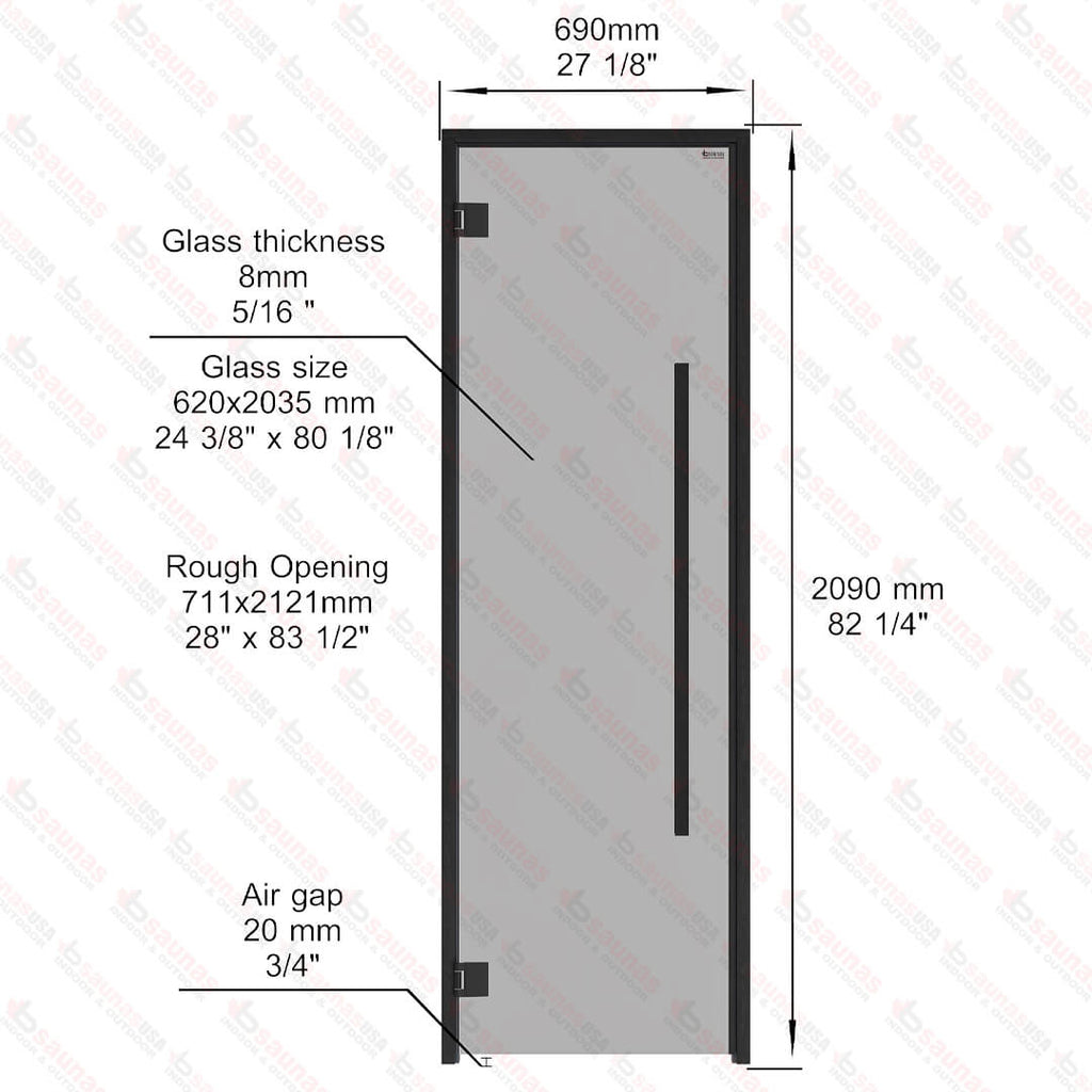 Aspen Black Frame Door Benelux Square, Grey Glass, 690×2090 mm (27 1/8″ x 82 1/4″) - West Coast Saunas - BSAUNAAGGBSD2R