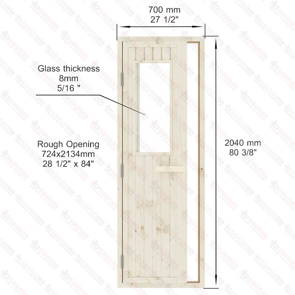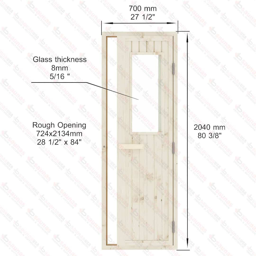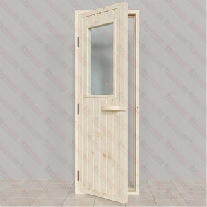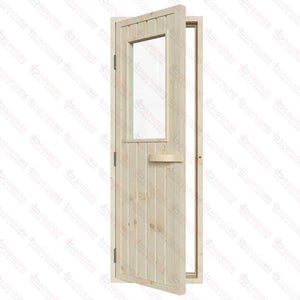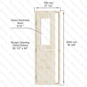 The Spruce Door with Glass Window is a robust and visually appealing addition to your sauna project, combining durability with a touch of elegance. Designed for both indoor and outdoor use, this door is a perfect blend of traditional craftsmanship and modern functionality. The door and its frame are crafted from Western Red Cedar, a wood celebrated for its strength, natural resistance to weather, and timeless aesthetic.